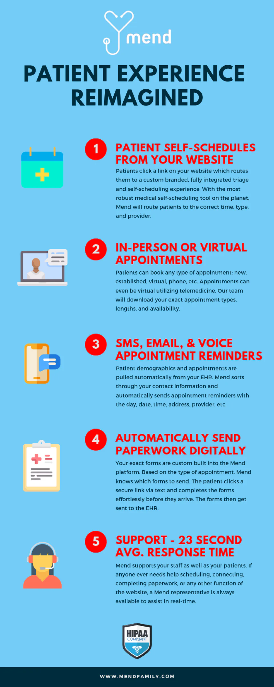 Plateforme de santé n° 1 pour la planification automatique des patients, la replanification et les annulations automatisées. Mend s'intègre totalement à votre calendrier principal pour gérer la disponibilité des fournisseurs, les emplacements, les types de rendez-vous et bien plus encore.